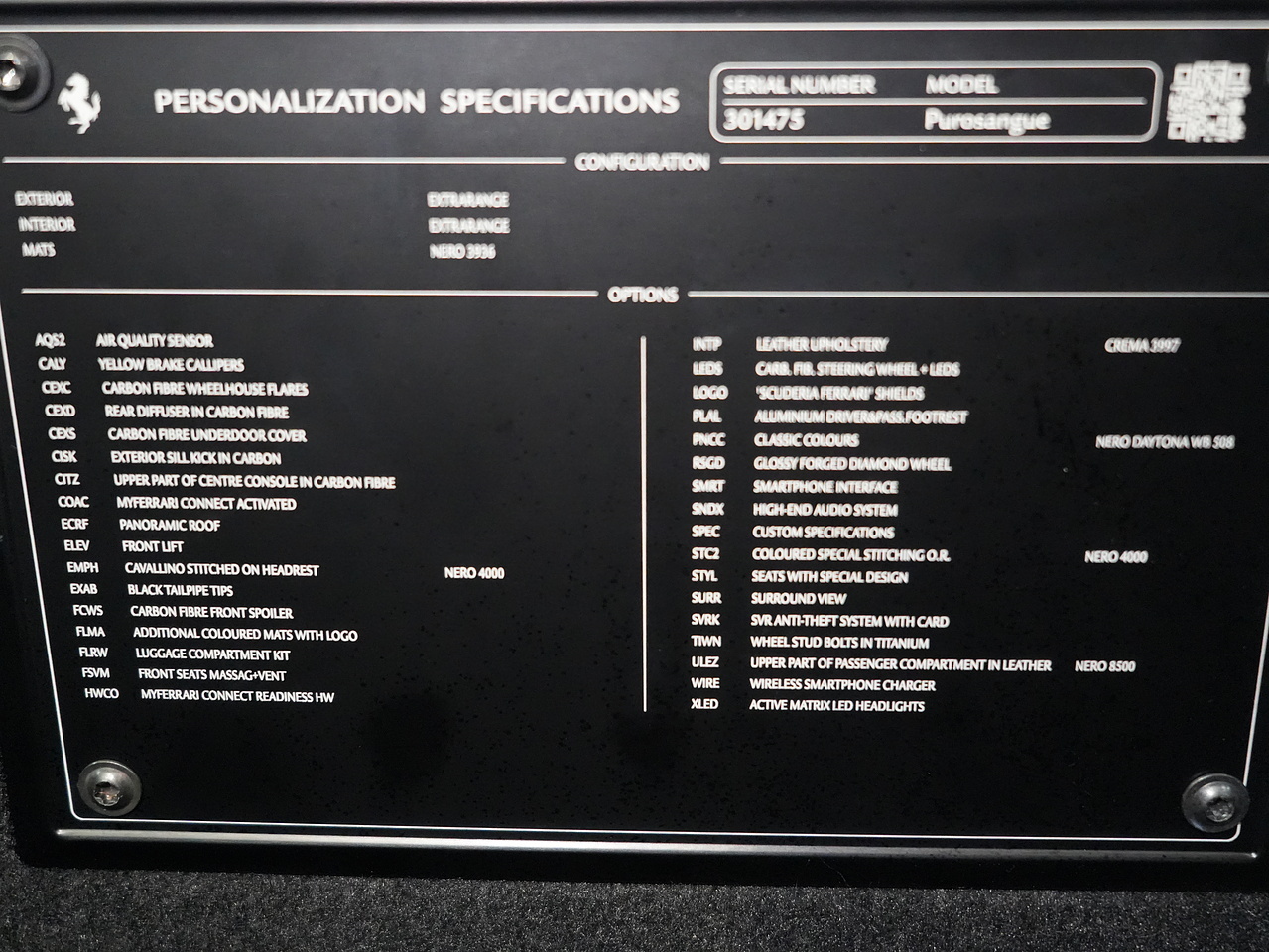 Inside and out, this Purosangue showcases a huge carbon fibre specification, including extensive exterior carbon detailing and interior carbon trim packages — adding both visual drama and weight-saving performance benefits.