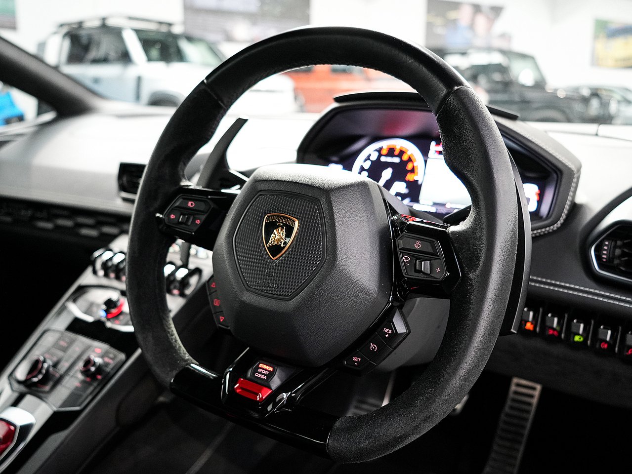Under the sculpted body lies a 5.2-ltr engine producing610 horsepower, channelled through a lightning-fast 7-speed dual-clutch transmission and Lamborghini’s signature all-wheel-drive system. The result is blistering performance—0 to 100 km/h (62 mph) in just 3.2 seconds—accompanied by the unmistakable symphony of a naturally aspirated V10